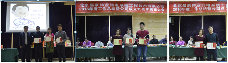 靈猴辭舊歲,金雞迎新春,2017年2月11日上午,北京易豪偉業(yè)弱電系統(tǒng)工程技術(shù)有限公司2016年度工作總結(jié)表彰暨公司成立15周年慶祝大會(huì)在懷柔鵝和鴨山莊隆重舉辦。北京總公司、江蘇分公司、成都分公司、山東分公司全體員工歡聚一堂,總結(jié)過去、研討未來、表彰先進(jìn)、共迎新春,會(huì)議由總經(jīng)理助理靳總主持。