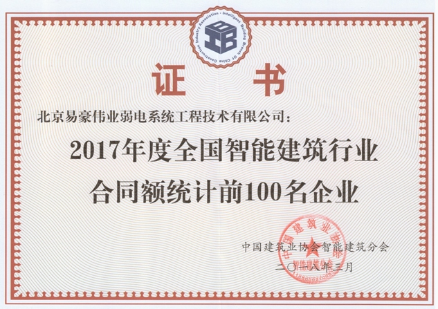 2018年3月,經(jīng)中國建筑業(yè)協(xié)會(huì)智能建筑分會(huì)的評(píng)選,我司榮獲“2017年度全國智能建筑行業(yè)百強(qiáng)企業(yè)”榮譽(yù)稱號(hào)。