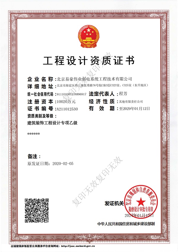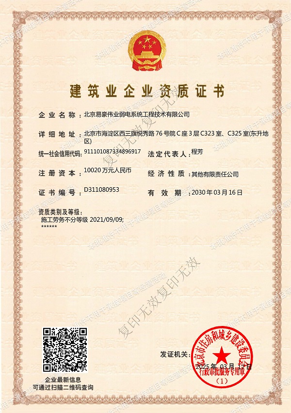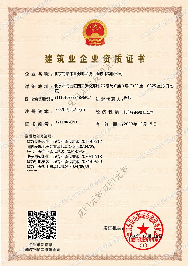 電子與智能化工程專業(yè)承包壹級(jí)、建筑工程施工總承包貳級(jí)、建筑裝修裝飾工程專業(yè)承包貳級(jí)、
